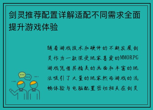随着游戏技术和硬件的不断发展,《剑灵》作为一款深受玩家喜爱的MMORPG游戏,凭借其精美的画面和丰富的玩法吸引了大量的玩家。然而,游戏的流畅体验与电脑配置密切相关。在《剑灵》的游戏过程中,如何选择一款适合自己需求的配置,成为了不少玩家提升游戏体验的关键所在。本文将从多个角度详细解析《剑灵》推荐配置,帮助玩家根据不同需求做出合理的配置选择,从而获得更加流畅和舒适的游戏体验。